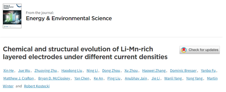 尽管富锂正极有着两种活性氧化还原中心,包括阴离子和阳离子贡献,可以使锂离子电池获得出色的比能量,但它们在不同电流密度下的行为尚未被阐明。近日,学院何欣研究员与美国劳伦斯伯克利国家实验室的Robert Kostecki通过研究不同电流下富锂中的渡金属(TMs)和氧的氧化状态,对他们的氧化还原活性进行比较研究,提出了从Li八面体到Li四面体的结构变化的详细机理,以及氧空位在Li+扩散中的作用。相关研究成果“Chemical and structural evolutions of Li-Mn-rich layered electrodes under different current densities”发表在材料领域国际期刊《Energy& Environmental Science》上,德赢AC米兰中国官方网站何欣研究员为本文共同一作和共同通讯,化工学院为本文第一作者单位。