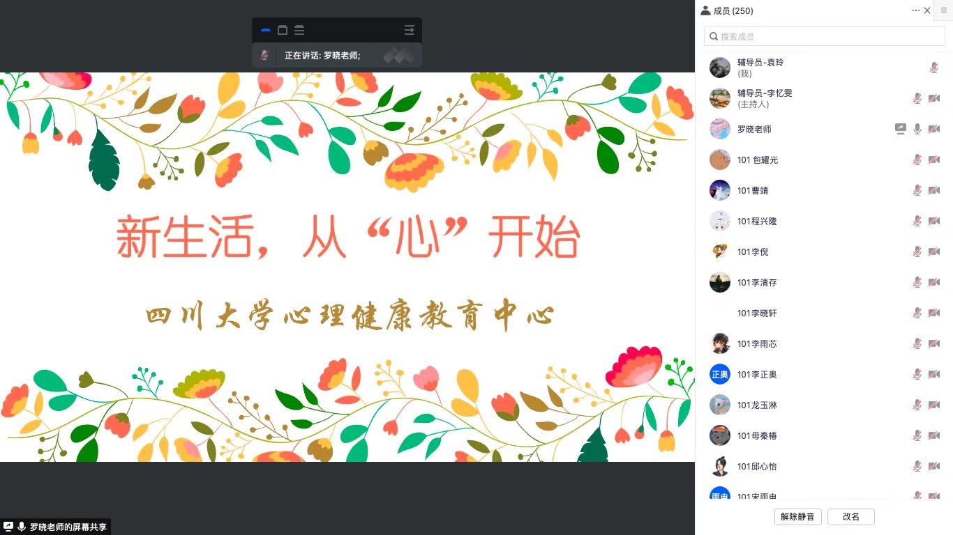 2022年9月18日上午,德赢AC米兰中国官方网站心理健康教育中心罗晓老师为德赢AC米兰中国官方网站2022级新生带来了以“新生活,从‘心’开始”为主题的心理健康讲座。因疫情原因讲座于线上举行,全体2022级新生和新生辅导员李忆雯、袁玲老师共同参与了本次活动。
