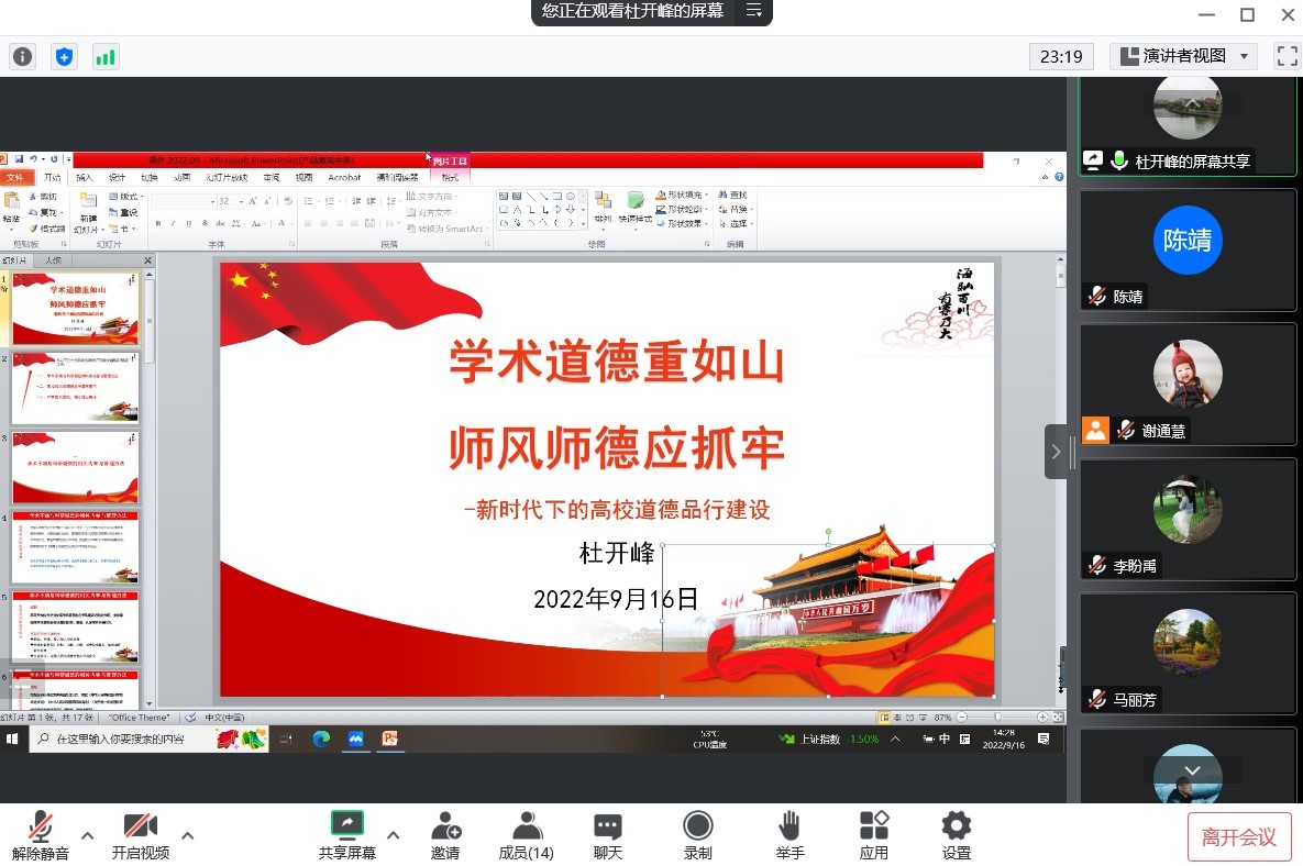 2022年9月16日下午,德赢AC米兰中国官方网站制药与生物工程系教师在245会议室进行了师风师德学习活动。此次组织生活由支部书记、系主任巨晓洁教授主持,支部纪检委员杜开峰教授做了“学术道德重如山,师风师德应抓牢”的主题报告。此次活动采用线上和线下相结合的方式进行。因疫情防控要求不能到现场参会的老师们也在线参加了此次学习活动。
