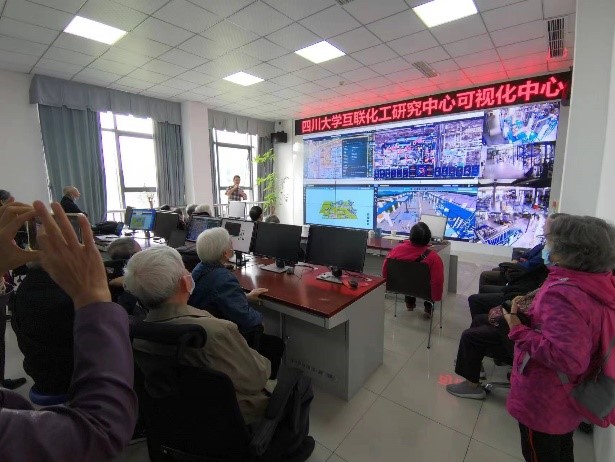 在卓工楼204室,互联化工研究中心的戴一阳老师为各位老教师们进行了一场生动的“可视化教学”:初步了解“互联网+化工”的现代应用方式后,戴一阳老师用化工园区的应用案例操作演示,实时监控反馈园区的安全系统等,将互联手段融入化工生产。随后,互联化工研究中心主任吉旭老师介绍了互联化工专业的设立过程和发展前景。老教师们被青年教师对化工行业和学院发展倾注的热情所感染,由衷地祝贺师生们取得的重要成果,并鼓励大家继续为专业发展出谋划策、不断创新。