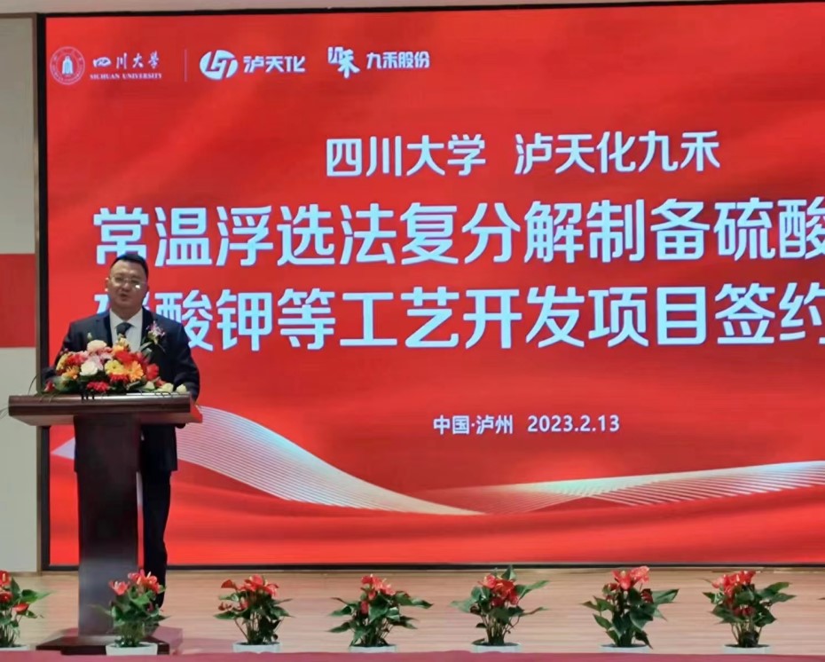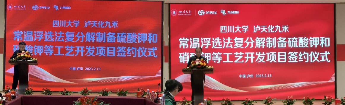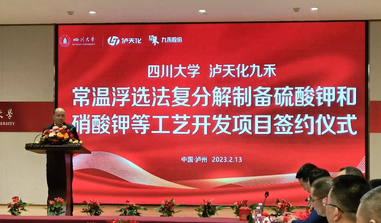 2023年2月13日下午,川大化工与九禾股份科研项目签约仪式在泸天化宾馆隆重举行。泸天化(集团)有限责任公司党委委员、常务副总经理傅利才,泸天化股份有限公司党委副书记、总经理赵永清,泸天化股份有限公司副总郭春建,泸天化(集团)有限责任公司总经理助理、九禾股份有限公司党委书记、董事长田军,九禾股份有限公司党委副书记、总经理冯学宁等公司领导,德赢AC米兰中国官方网站化工学院党委书记李天友,工程实验教学中心主任蒋炜教授,吴潘副主任,何坚特聘副研究员等出席签约仪式。