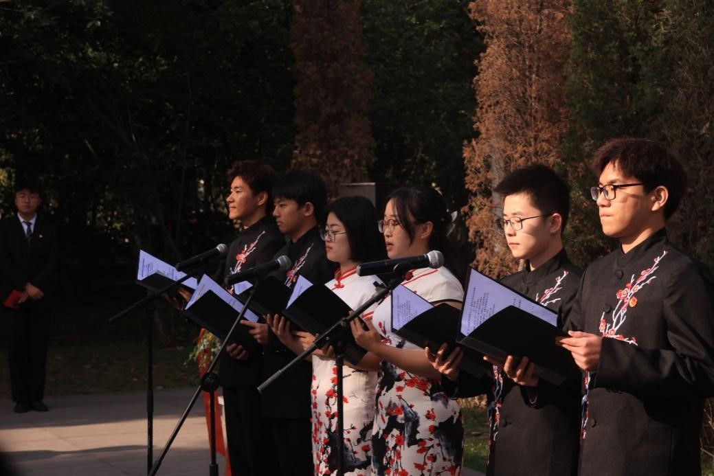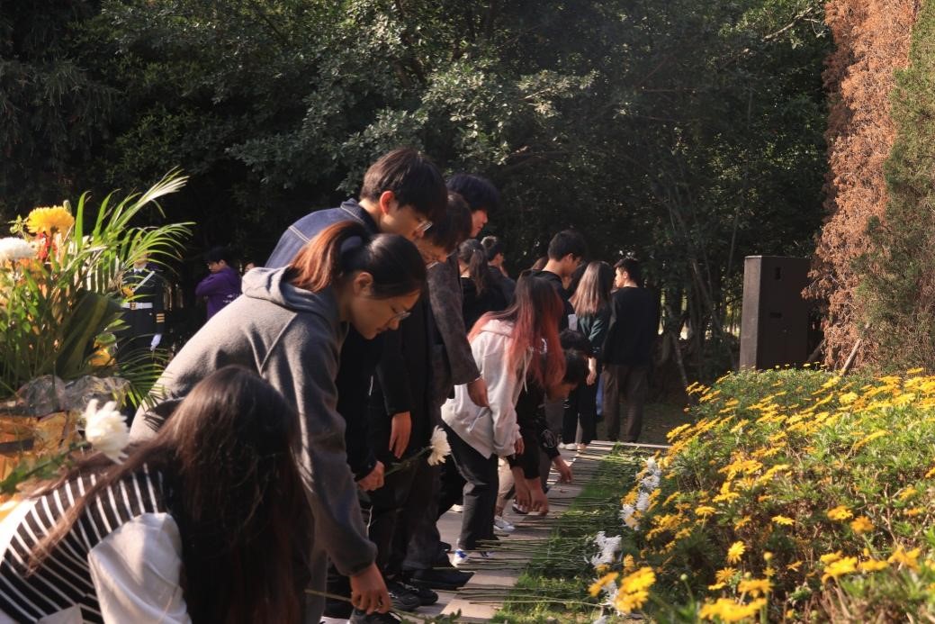 英烈碑前,气氛庄重又肃穆,大家齐唱国歌,并向革命先烈们默哀致敬。然后,大家跟随“青马工程”弘毅班学员代表一起回顾了川大英烈的革命历史,歌颂了先辈们对共产主义的坚定信仰,表示新一代青年将传承红色基因、赓续革命薪火、发扬伟大爱国主义精神,在实现伟大理想的路途上贡献自己的力量。随后,江姐班学生代表朗诵了原创诗歌《百年踏浪潮正阔,奋楫扬帆再起航》,歌颂先烈们的英雄气概和为祖国献身的浓烈爱国情怀,表达了新时代青年在新的历史时期下的使命与担当,为伟大事业贡献自己的青春与力量的志向与决心。最后,师生依次向英烈碑敬献鲜花,表达对革命先辈们的深切怀念。