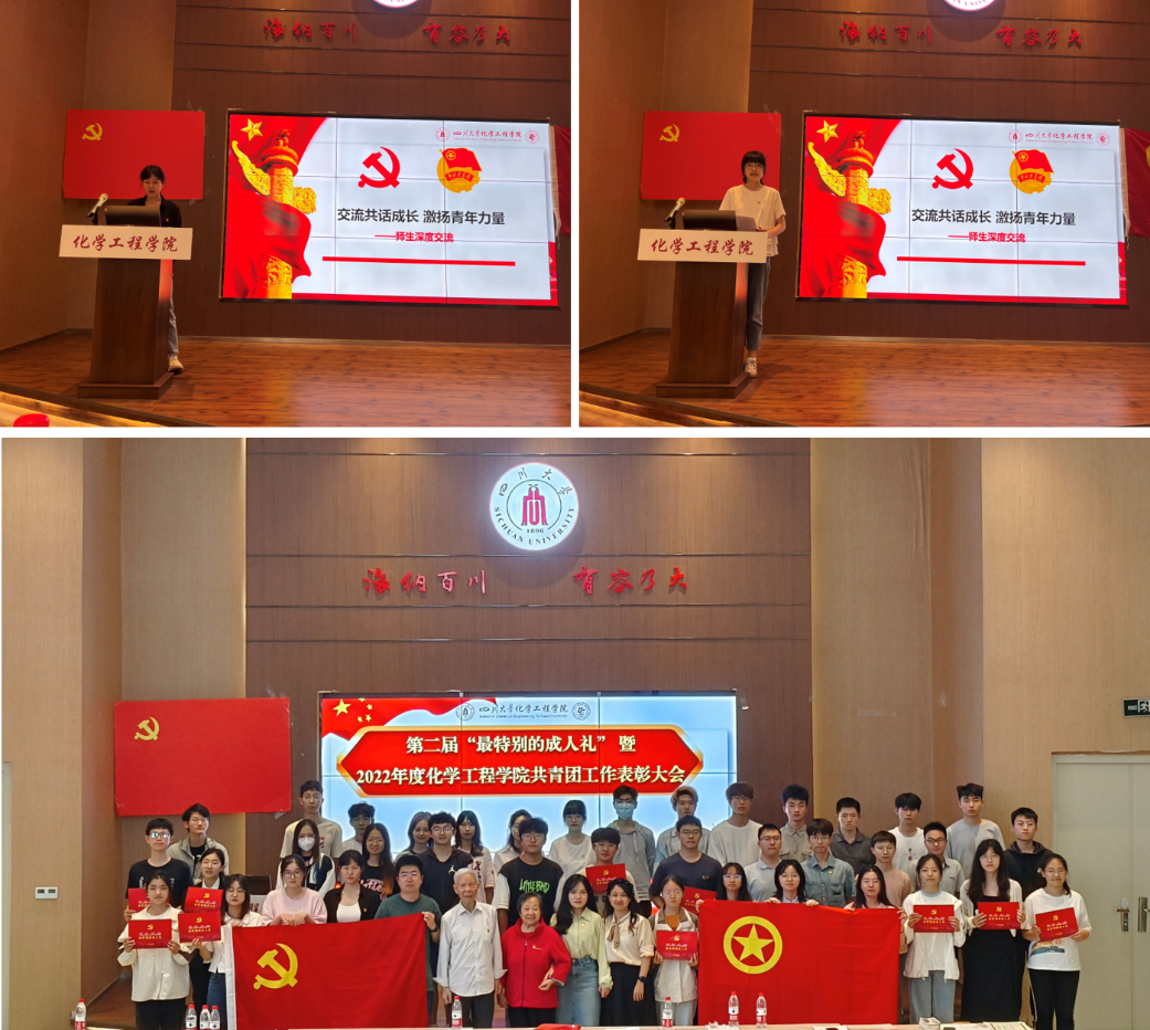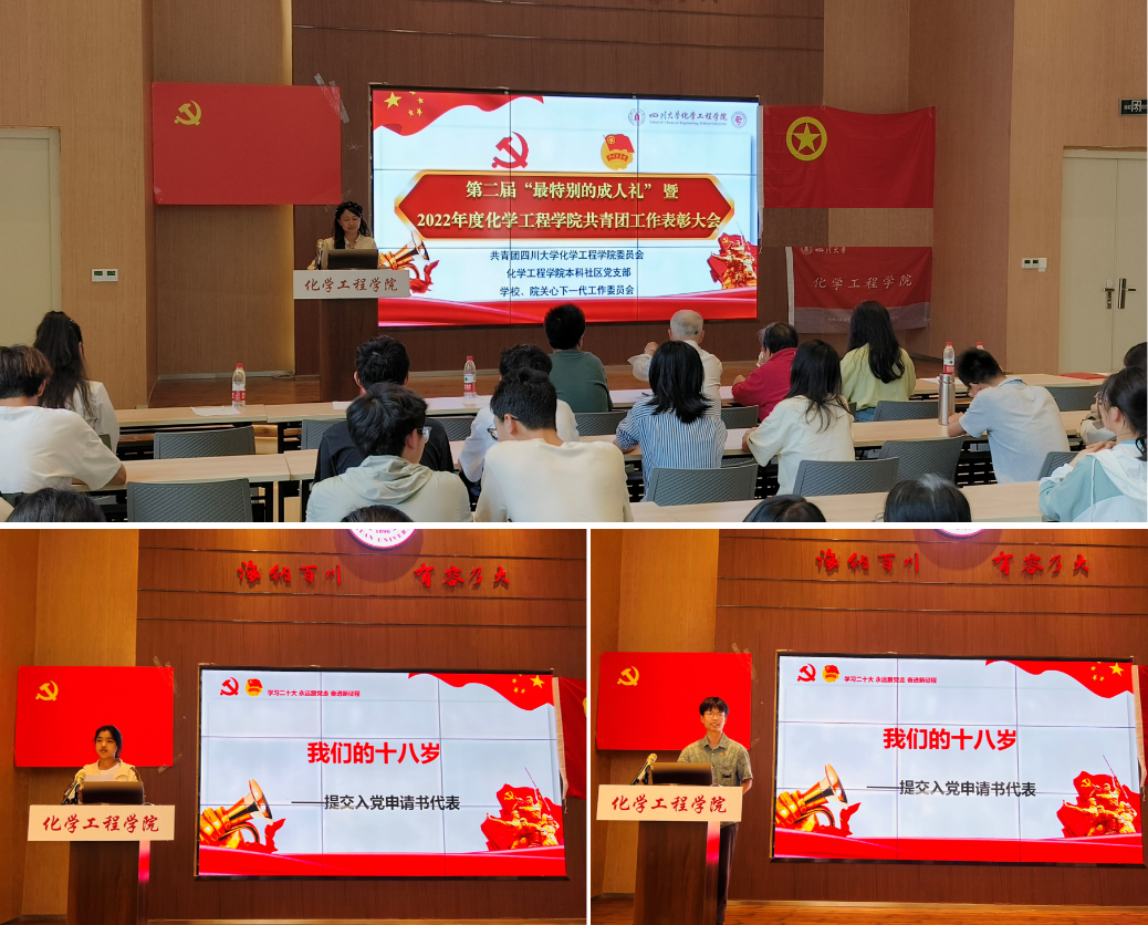 为深入学习贯彻党的二十大精神,树立典型、表彰先进,激励青年奋发向上、勇担使命,为筑牢化工团员使命担当,坚定理想信念,不断锤炼自身,矢志不移向党组织靠拢,德赢AC米兰中国官方网站团委联合本科社区党支部,于5月27日在江安校区西园22舍报告厅隆重举办德赢AC米兰中国官方网站第二届“最特别的成人礼”暨2022年度德赢AC米兰中国官方网站共青团工作表彰大会。校、院关工委梁明征老师、傅运清老师,学院团委书记李珍珍老师、辅导员付率老师、袁玲老师,2022年度学院共青团工作受表彰集体和个人代表,以及2022级团员代表等参与本次大会。