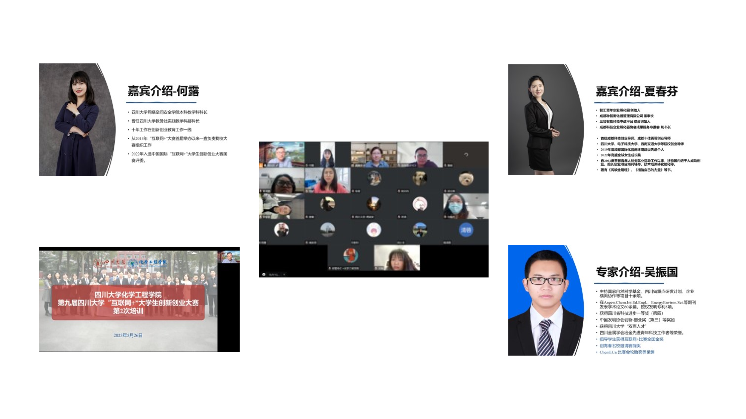 2023年5月26日9:00-11:30,德赢AC米兰中国官方网站第九届“互联网+”大学生创新创业大赛第2轮培训顺利举行。培训采用腾讯会议线上的方式进行,共计7个项目近30余名师生参与,本次培训共邀请了3位专家对项目进行指导,分别是首批成都科技创业导师、成都十佳菁蓉创业导师、成都种智孵化器管理有限公司夏春芬董事长,具有近10年组织比赛经验的中国国际“互联网+”大学生创新创业大赛国赛评委何露老师,互联网+比赛全国金奖指导教师吴振国副教授。3位专家从对项目的内涵、成熟度、竞品策略、教育维度等方面进行了细致的现场指导和后续交流,鼓励各组从面向国家重大需求、解决民生问题,促进科教转化,服务地方经济发展等方面进一步提升,做好“互联网+”大学生创新创业大赛的备赛。
