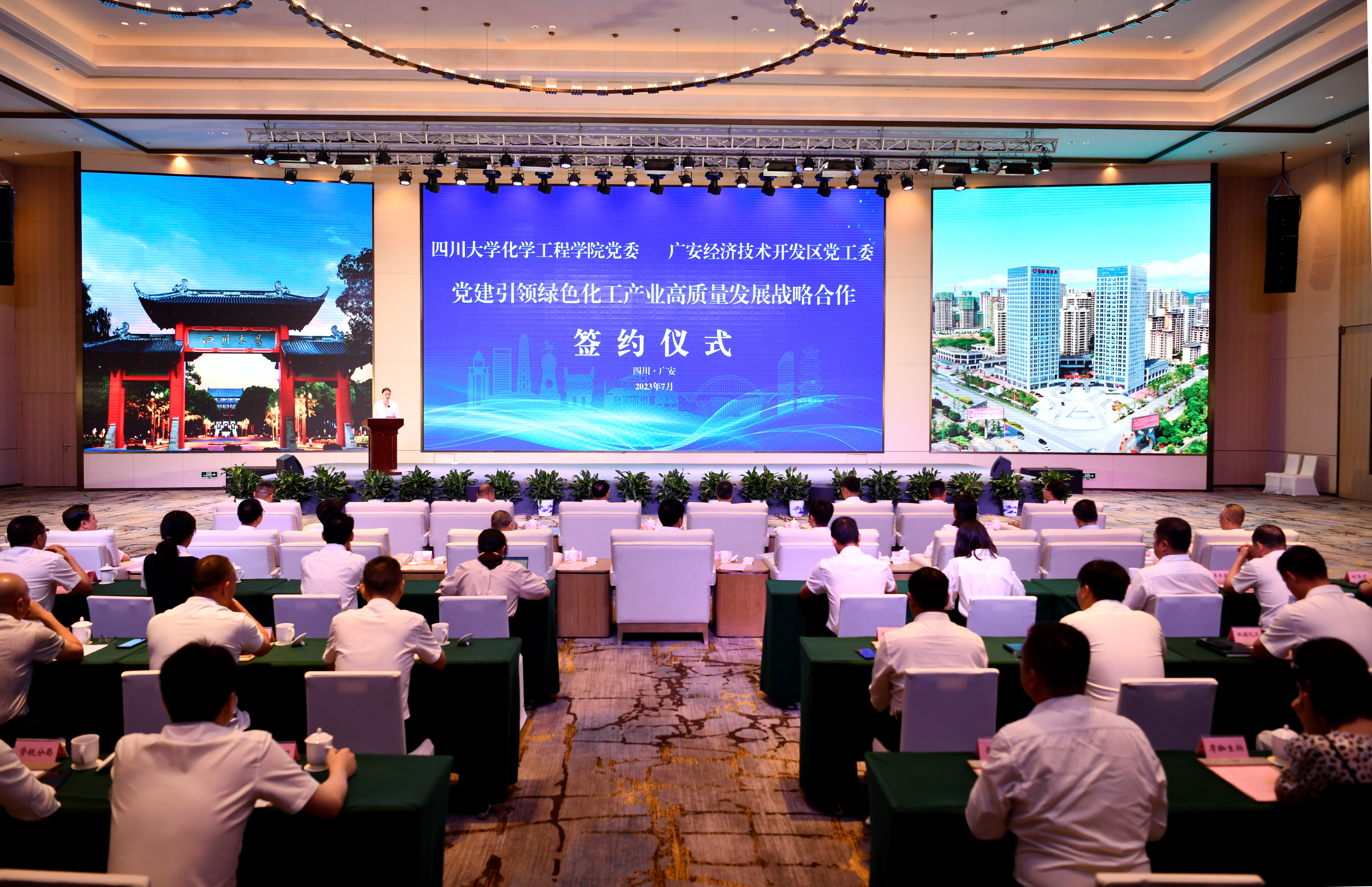2023年7月5日,德赢AC米兰中国官方网站党委——广安经开区党工委党建引领绿色化工产业高质量发展战略合作签约仪式在广安举行。德赢AC米兰中国官方网站副校长梁斌,广安市人大常委会党组成员、副主任、广安经开区党工委书记杨世章,广安市副市长罗永平,德赢AC米兰中国官方网站党委书记李天友、院长郭孝东等以及广安经开区相关党政、各行业、企业家代表出席会议。签约仪式由广安经开区党工委副书记、管委会主任李婧主持。