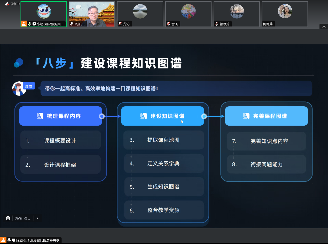 该项目由周加贝副教授主持,赖雪飞老师、龙沁老师协助,由上海卓越睿新数码科技股份有限公司负责建设。在启动会上,上海卓越睿新数码科技股份有限公司陈超老师详细介绍了知识图谱的建设和应用,包括课程知识图谱的八步建设流程、"四维"体系的构建及其在教学和学生自主学习中的应用。