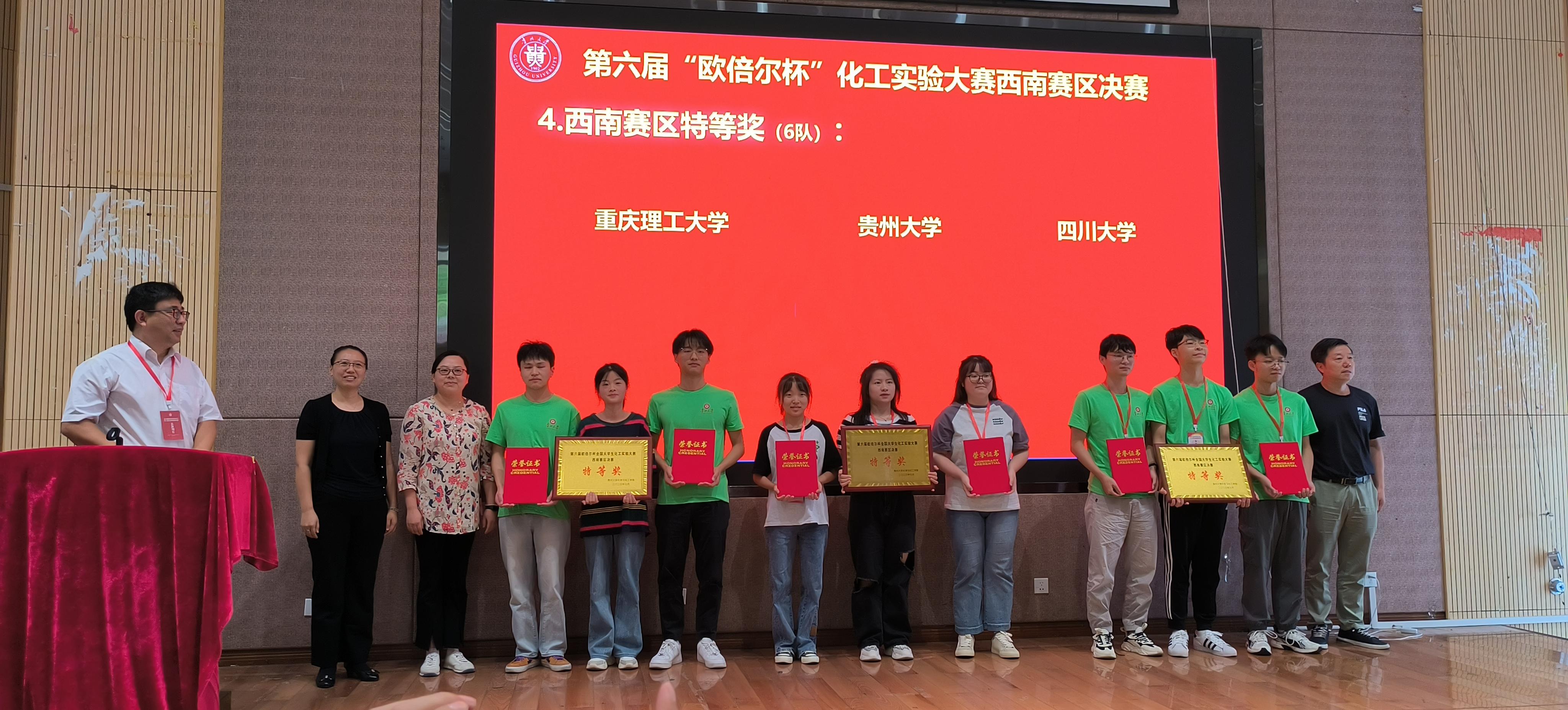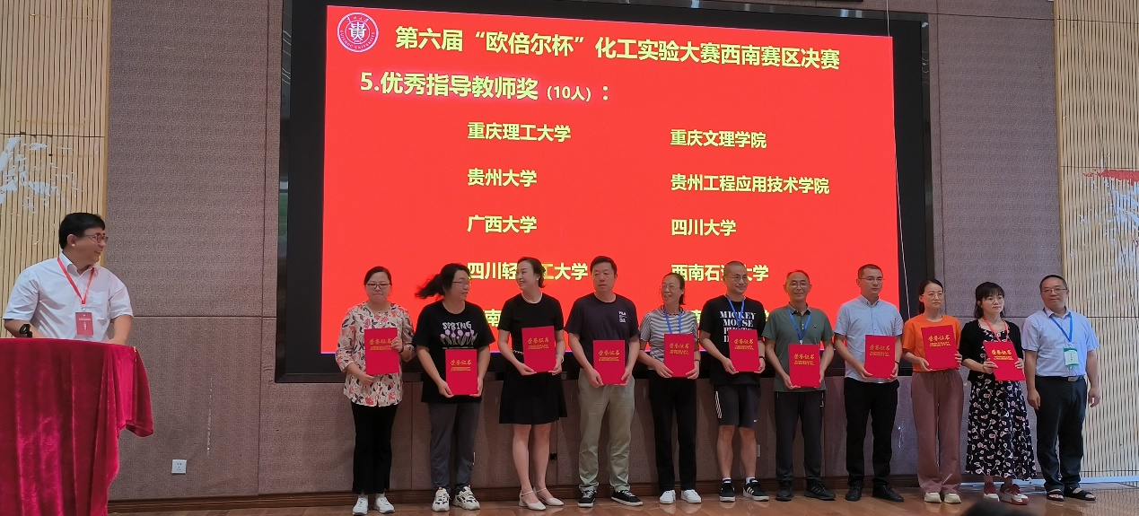 经过两天的激烈竞赛角逐出西南赛区决赛特等奖6名,一等奖12名,二等奖30名。郭炳邑、杨俊和陈松三位同学获得西南赛区特等奖,按照竞赛规则,成功入围今年8月中旬于北京化工大学举办的第六届全国大学生化工实验大赛全国总决赛。同时程远贵老师荣获优秀指导教师奖。