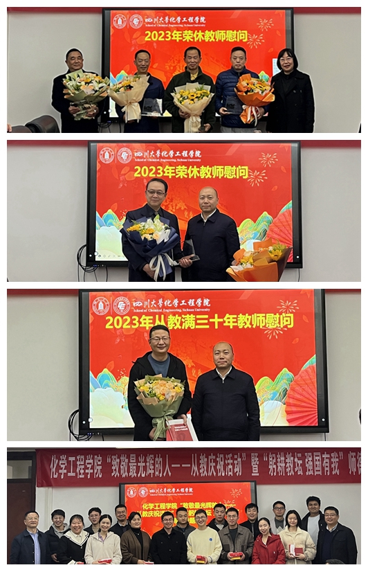为深入学习贯彻党的二十大精神,深刻学习领会习近平总书记关于教育的重要论述,2023年12月7日下午,学院在望江校区化工楼开展“致敬最光辉的人”从教庆祝活动暨“躬耕教坛 强国有我”师德专题教育。学校党委教师工作部马涛副部长到会指导,院党委书记李天友、工会主席穆畅道和学院当年荣休教职工、从教三十年教职工以及新入职教职工等30余人参加此次活动。活动由学院党委副书记兼纪委书记李德富主持。