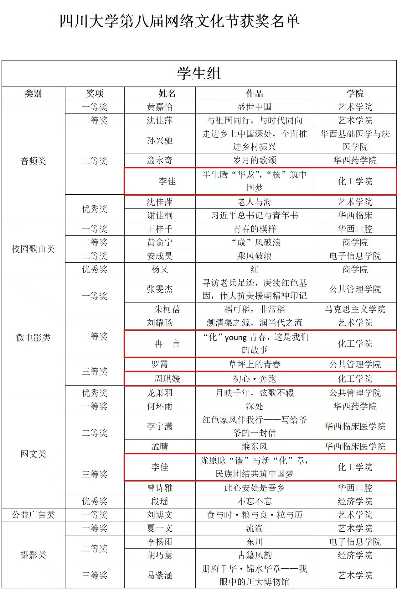 学生的参赛作品中,《半生腾“华龙”,“核”筑中国梦》荣获音频类三等奖;《“化”young青春,这是我们的故事》荣获微电影类二等奖;《初心·奔跑》荣获微电影类三等奖;《陇原脉“谱”写新“化”章,民族团结共筑中国梦》荣获网文类三等奖。