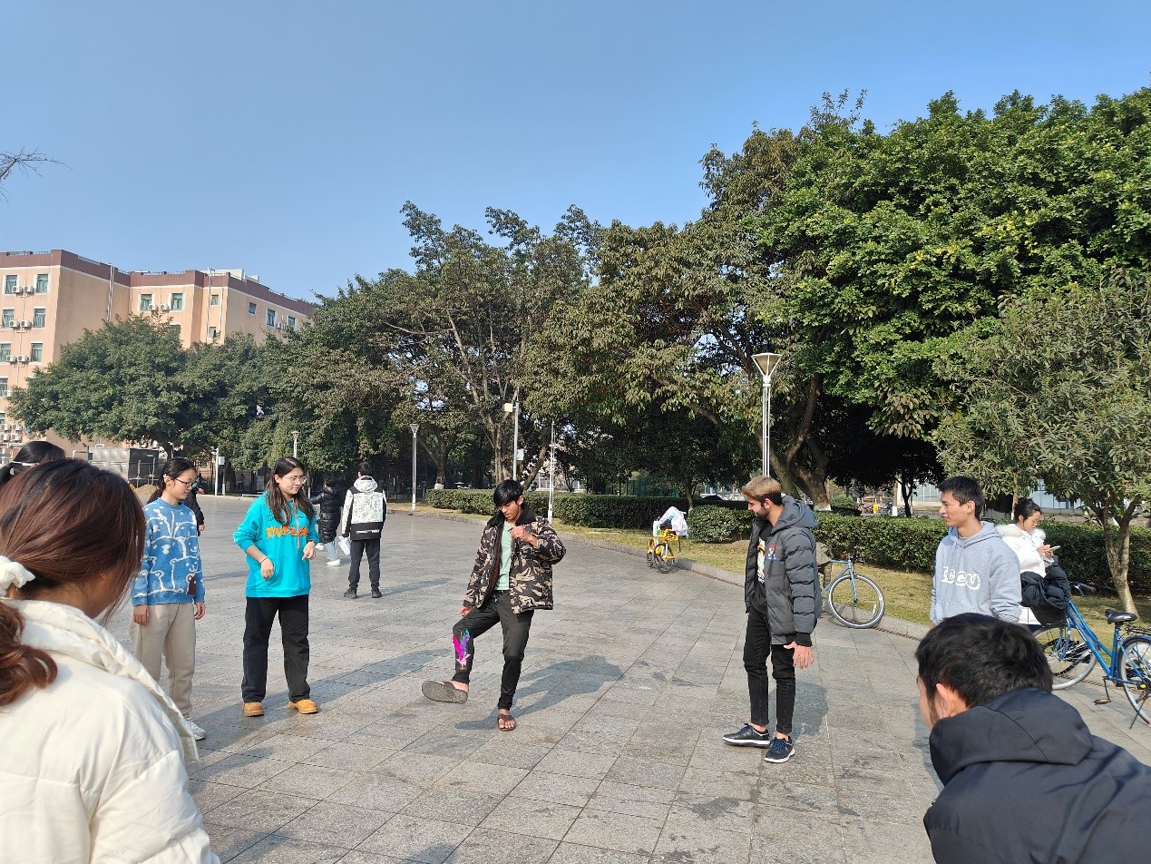 中午12点,参与活动的同学陆续来到青春广场。在活动开始之前,同学们或是自己拿起毽子开始踢起来,或者和三两好友,一起相互传递。活动正式开始之后,同学们10个人围成一个圈,相互踢毽子传递起来,留学生与港澳台学生更是一起向其他同学展示他们的踢毽子学习成果,加入到队列当中。老师们也积极的和同学们互动起来,现场其乐融融。在这样一个或单人、或多人协作的踢毽子活动当中,同学和老师们一起踢动双脚,共同让毽子高高飞起。