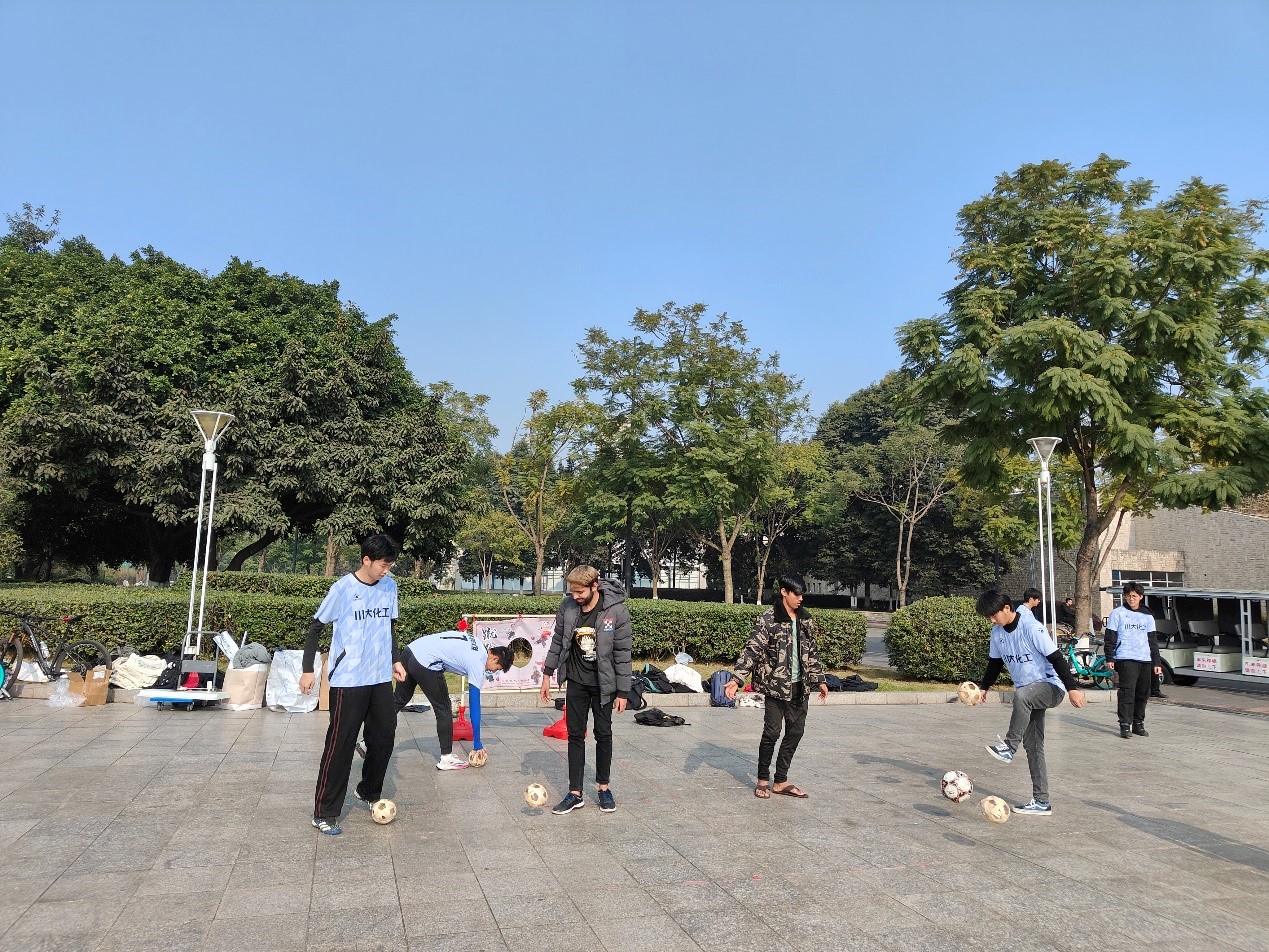 之后,拥有悠久历史的蹴鞠活动开始了。首先由留学生、港澳台学生和其他学生组成的五人小组,向各位同学展示了蹴鞠表演。随后,参与蹴鞠活动的同学们被分成三人一组,共同进行了一场蹴鞠比赛,老师、留学生、港澳台和其他学生一起将蹴鞠不断踢过立牌,同学们或用身体,或用头部,或一记大力,或轻轻踢出,各种动作不断吸引着其他同学的兴趣。