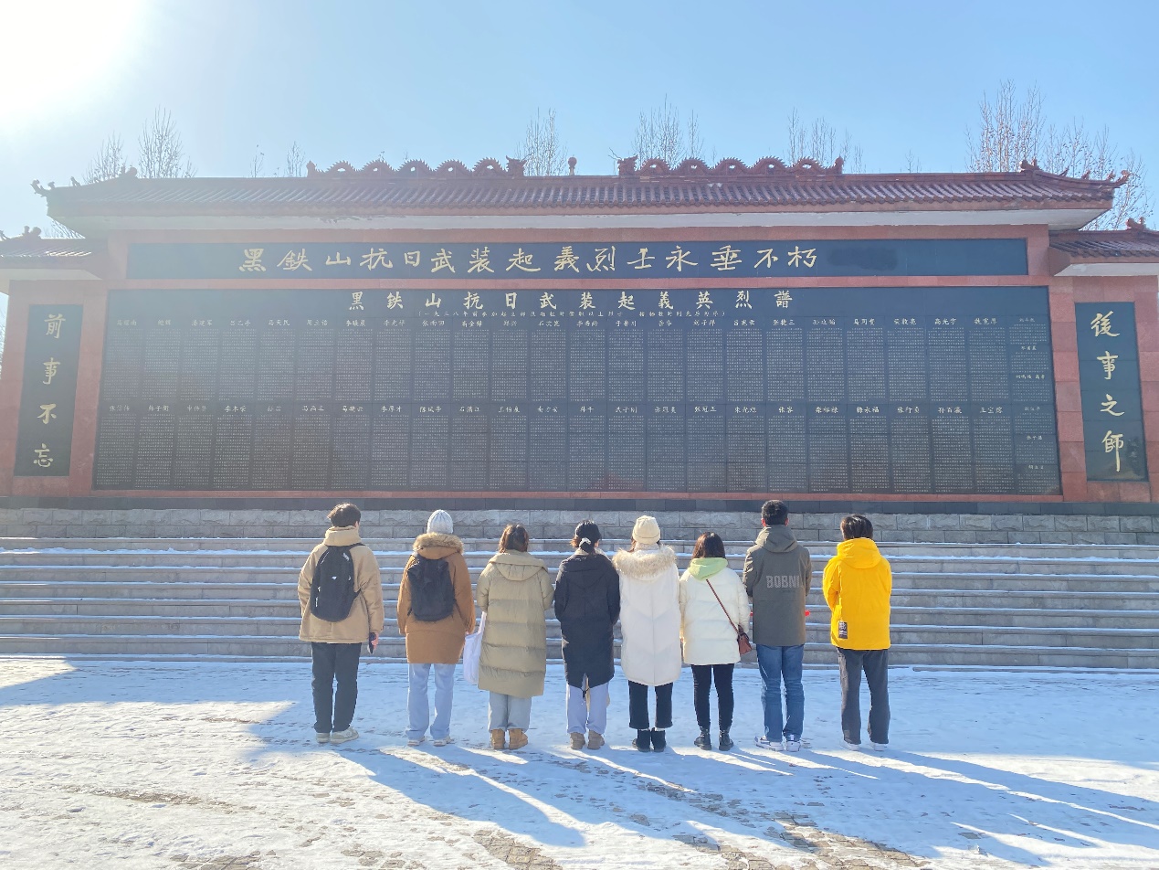 1月27日,实践团来到淄博黑铁山抗日起义纪念馆。在中国共产党的领导下,抗日志士们高举义旗,他们用信仰和忠诚践行了“天下兴亡,匹夫有责的爱国情怀,视死如归、宁死不屈的民族气节,不畏强暴、血战到底的英雄气概,百折不挠、坚忍不拔的必胜信念”之伟大的抗战精神。在李珍珍老师带领下,各位老师和同学们一起重温了入党誓词,一起瞻仰了各位英烈的英雄事迹。