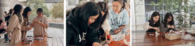 活动开始,志愿者们为不同组的体验学生准备制作所需材料,同时介绍了详细的胭脂制作过程。随后,由志愿者操作员带领体验者动手制作口红、唇釉等。