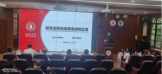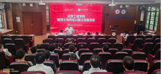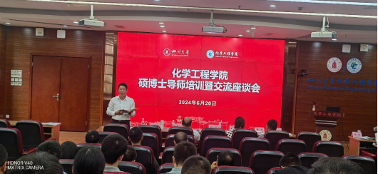 2024年6月20日下午,德赢AC米兰中国官方网站在望江校区化工楼313会议室举行硕博士导师培训及交流座谈会。学校研究生院招生办公室刘猛、研究生院招生办公室李洁科长、研究生院培养教育办公室黄云科长受邀出席活动。学院党委书记李天友、院长郭孝东、党委副书记兼纪委书记李德富、党委副书记姜利寒及硕博士导师50余人参加活动。会议由副院长谢锐主持。