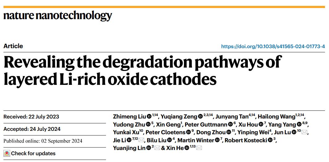 近日,德赢德赢AC米兰中国官方网站何欣研究员团队在国际知名期刊Nature Nanotechnology上发表题为Revealing the degradation pathways of layered Li-rich oxide cathodes的研究文章。通过整合形貌、结构和从单个原子的氧化态演化到次级颗粒的分析,经过纳米尺度到微尺度的表征,确定了与颗粒内非相反应相关的不同结构变化途径。
