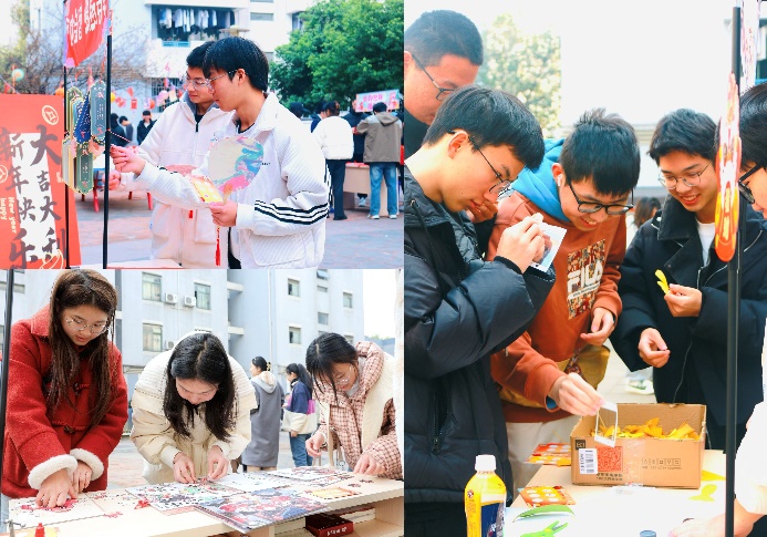 写福字区域,同学们挥毫泼墨,书写着一个个饱含新春祝福的“福”字,一笔一划间传递着对新年的美好祝愿。剪纸摊位上,同学们用灵巧的双手将一张张彩纸变成精美的剪纸作品,栩栩如生的生肖图案展现了传统剪纸艺术之美。