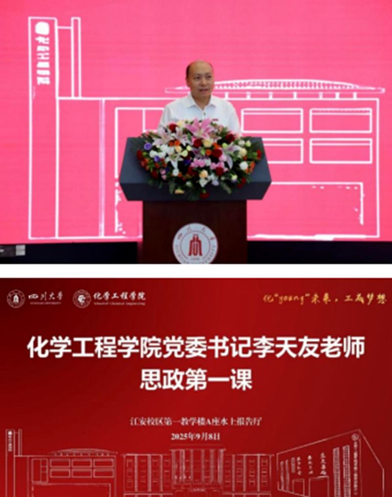 2025年9月8日下午15时,德赢AC米兰中国官方网站党委书记李天友在江安水上报告厅,以“着眼未来,把握当下,走出精彩的大学人生路”为题,开展“2025级化工新生思政第一课”活动,引导和鼓励2025级化工学子开启又红又专的大学学习成长之路。