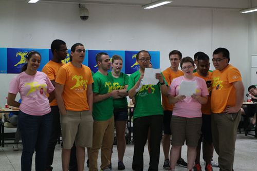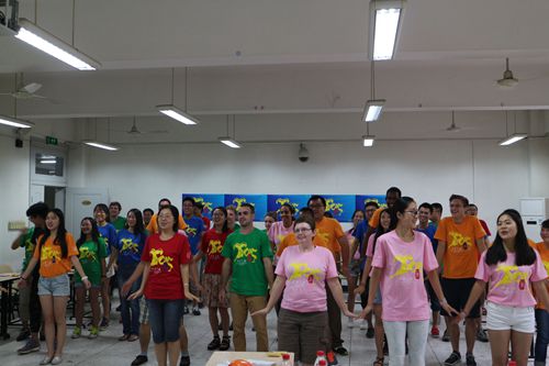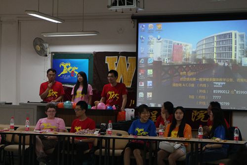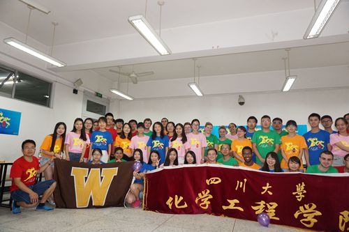 7月14日下午,在江安一教A103, 经过交流营工作组精心布置后,“化工之旅2015”国际交流营活动之中外学生联欢会准时开场了,来自美国西密歇根大学的15位外籍学生,与化工学院本科学生欢聚在一堂,他们身着“化工之旅2015”国际交流营统一体恤,青春的笑脸和青春的气息把江安一教A103装扮得分外艳丽。