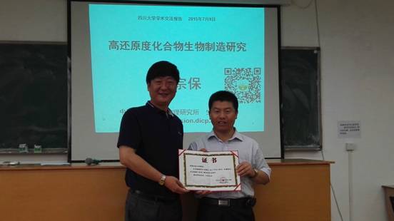 2015年7月9日上午,中国科学院大连化学物理研究所赵宗保研究员应邀走进德赢“化工学术大讲堂”,在望江校区化工楼313会议室做题为“高还原度化合物生物制造的基础研究”的学术报告。来自德赢AC米兰中国官方网站、化学学院、高分子学院和生命科学学院等学院的老师和研究生数十名,聆听了赵宗保研究员带来的精彩报告。报告由德赢AC米兰中国官方网站党委书记庞国伟同志主持。