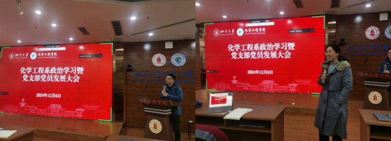 2024年12月6日下午,德赢AC米兰中国官方网站化学工程系党支部开展了组织生活与推荐确定入党积极分子大会。会议由汪伟老师主持,化学工程系全体党员同志参加。会议伊始,汪伟老师对近期支部党员发展工作进行了介绍,并就李红娇、邹宗鹏两位入党积极分子候选人的具体情况进行了详细介绍。在会议上,谢锐、唐思扬、吉俊懿等化工系党支部多位党员教师对两位入党积极分子候选人的情况进行了讨论和评议,充分肯定了两位候选人在思想政治、教书育人及社会服务等诸多方面的良好表现。通过民主推荐和评议,两位候选人被接受确定为入党积极分子。