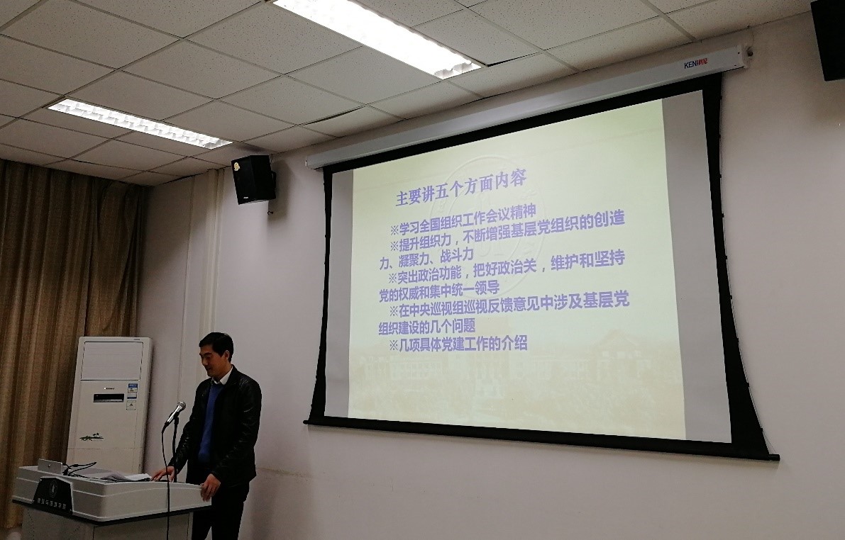 校党委组织部管清贵副部长以《提升组织力 把好政治关,扎实做好抓基层打基础工作》为题,向全体与会支部书记传达了学习贯彻全国组织工作会议精神并对几项具体党建工作进行了介绍。管部长带领大家一起回顾了全国组织工作会议的重点内容,并向大家介绍了党的十八大以来党的建设和组织工作方面的重点工作。讲到新时代党的建设的总要求,他说到,我们必须坚持和加强党的全面领导,坚持党要管党、全面从严治党,以加强党的长期执政能力建设、先进性和纯洁性建设为主线,以党的政治建设为统领,把党建设成为始终走在时代前列、人民拥护、勇于自我革命、经得起各种风浪考验、朝气蓬勃的马克思主义执政党。在不断增强基层党组织的创造力、凝聚力、战斗力板块,管部长结合新修订的《党章》和新出台的《中国共产党支部工作条例(试行)》,对党的组织生活制度进行了详细讲解。最后,他希望全体党支部书记充分发挥模范带头作用,发挥基层党组织政治引领作用,使其成为宣传党的主张、贯彻党的决定、领导基层治理、团结动员群众、推动改革发展的坚强战斗堡垒。