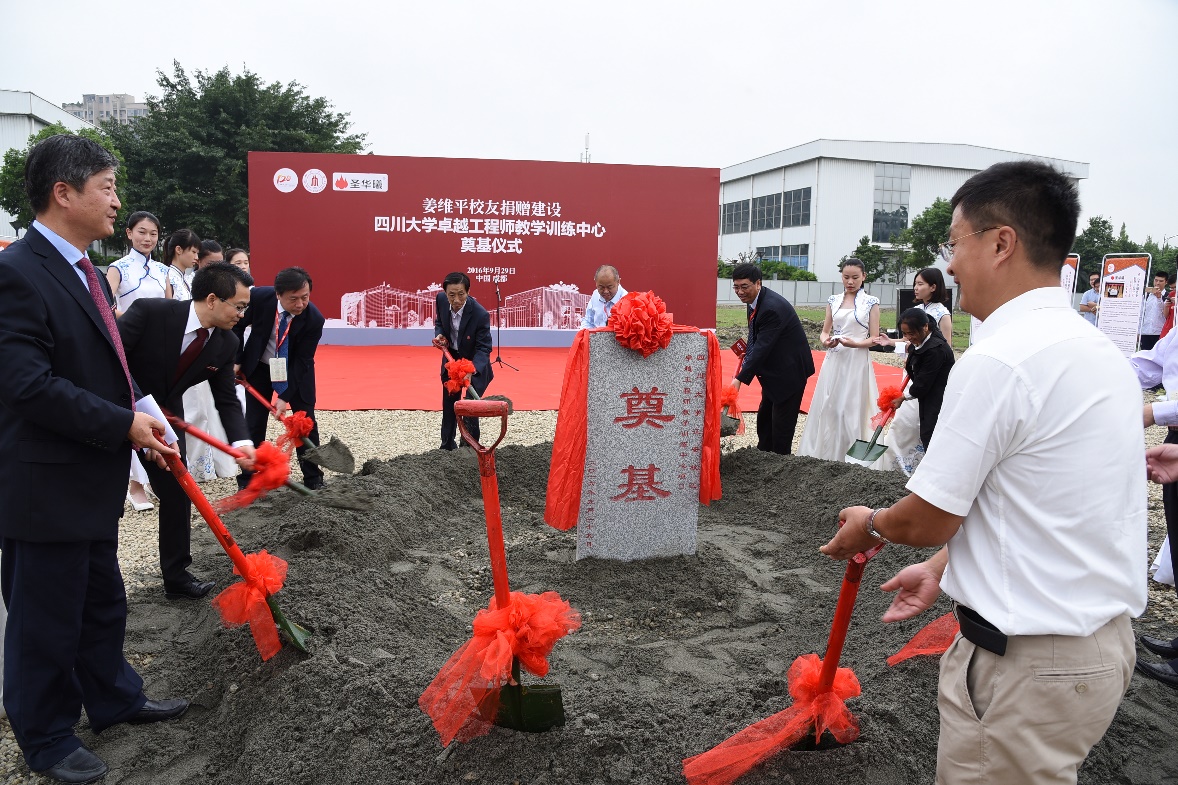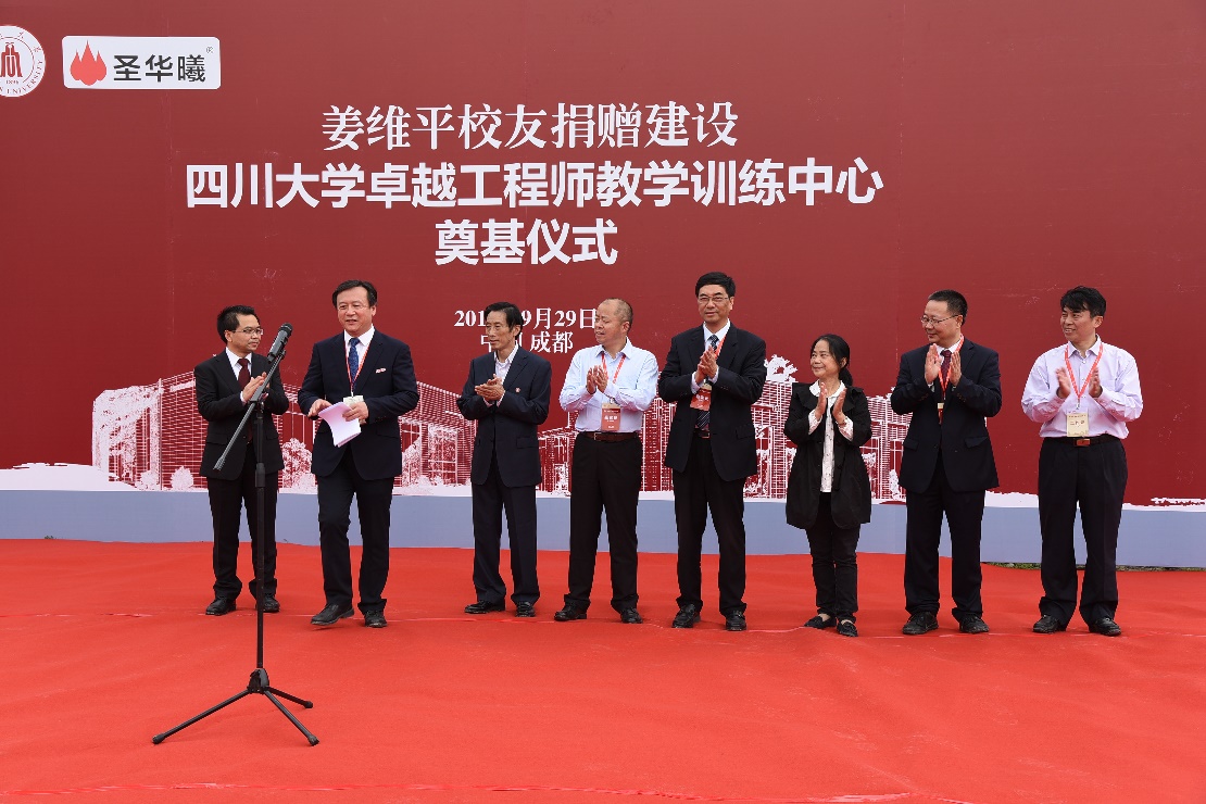 2016年9月29号上午11点,在全校师生喜迎德赢AC米兰中国官方网站120周年华诞之际,德赢AC米兰中国官方网站卓越工程师教学训练中心奠基仪式在江安校区环形大道北段、卓越工程师教学训练中心隆重举行。重庆圣华曦药业股份有限公司董事长姜维平及夫人李长渝女士、国家工商行政管理总局王江平副局长、德赢AC米兰中国官方网站党委副书记李向成教授、德赢AC米兰中国官方网站副校长许唯临教授、校长助理梁斌教授、规建处华国春处长、外联办荣建国主任、德赢AC米兰中国官方网站党委书记庞国伟、院长褚良银教授,部分师生及校友嘉宾等近300人共同见证了卓工大楼的奠基。奠基仪式由学院党委书记庞国伟主持。