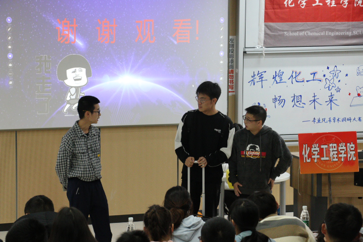 动装3班的同学们编演的小品,模拟了化工学院大一新生报道的场景。通过一系列的对话,从当代大学生的视角展现社会对化工行业的“误解”之深,将人们对于化工的担忧以幽默戏谑的方式呈现出来,既让观众忍俊不禁,又启发同学们站在更高的角度看待化工。