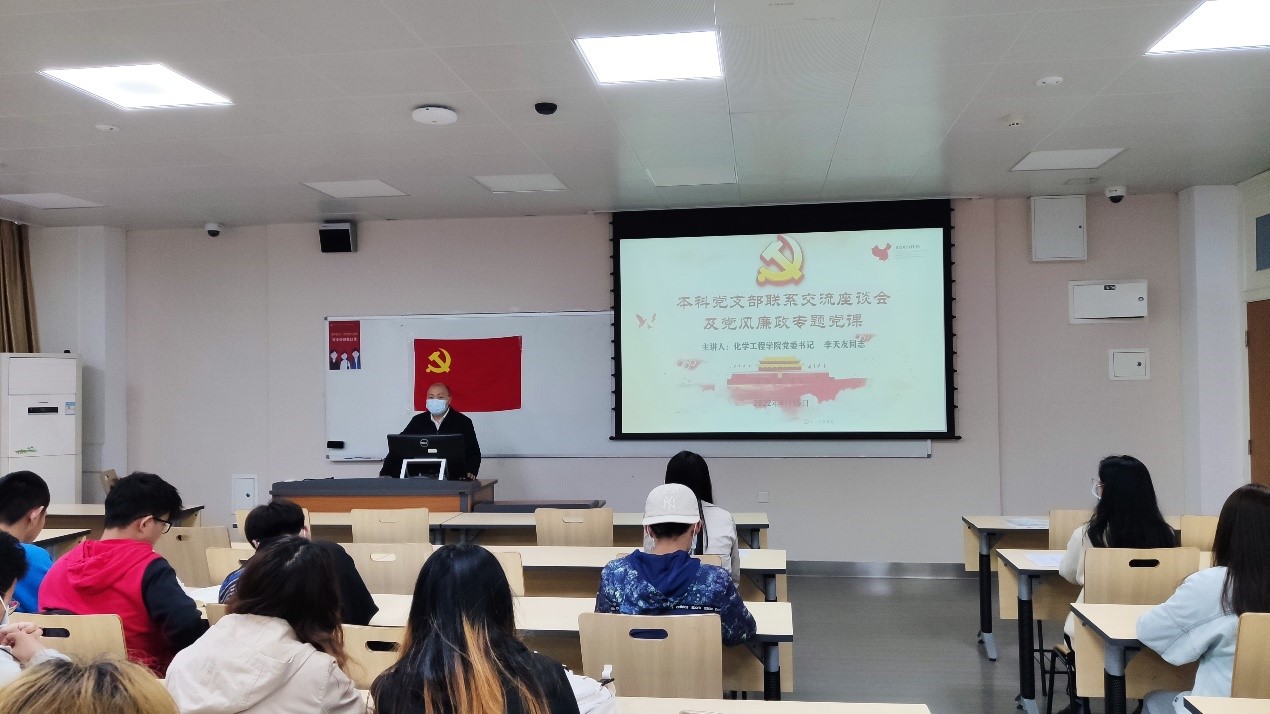 值喜迎德赢AC米兰中国官方网站70年院庆和党风廉政教育宣传月之际,为扎实推进新时代校园廉洁文化建设,引导本科学生党员同志坚守理想信念,2022年4月15日下午15:00,德赢AC米兰中国官方网站在江安校区第一教学楼A座101教室召开2018级、2019级本科党支部联系交流座谈会及党风廉政专题党课,李天友出席了座谈会并主讲了党风廉政专题党课。2019级本科党支部书记司振兵、2018级本科党支部书记李忆雯及党支部全体党员同志参加了活动。活动由司振兵同志主持。