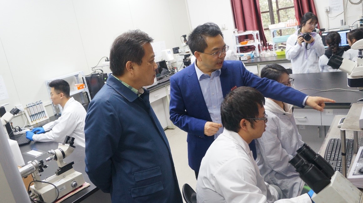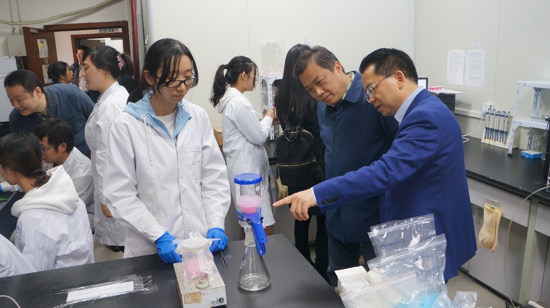 接着,钟家霖部长一行来到学院四楼膜科学与功能材料研究室。看到门口迎接的研究室师生,钟部长亲切热情地同他们一一握手。