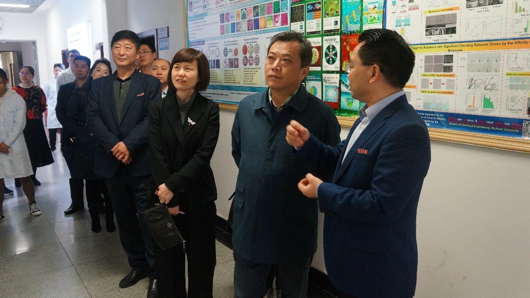 九三学社中央委员、九三学社四川省委副主委、学校科学技术发展研究院院长褚良银向钟家霖副部长介绍了膜科学与功能材料研究室门口悬挂的对联“智深道远莫等闲须将勤补拙,能高才富欲建功必以微求著”,对联除了激励同学们外,同时还暗含研究室主要研究方向的关键词。在褚老师的引导下,钟部长一行沿着走廊继续前行,走廊两侧是研究室精心布置的文化展示墙。在这里,褚老师向钟部长一行简要介绍了研究室的主要成员、研究方向以及代表性的科研成果。褚老师表示,研究室现在所做的方向是国际化工前沿的基础研究,瞄准的是化工行业的未来发展方向。研究室的五大研究方向由文化展示墙上五条简洁响亮的标语概括而成,褚老师钟钟部长一一介绍了这五条标语所代表的领域。同时,研究室每个房间都根据其功能进行了形象贴切的命名,如“膜法室”“风之谷”“汇微轩”“材富室”“求真殿”等等。钟部长对这种新型的工科实验室的文化建设给予了高度评价和赞扬。