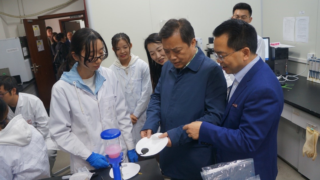 随后,钟部长一行来到了研究室的求真殿(分析室),一位同学正在使用冷冻超薄切片机进行样品的制备,钟部长对这种能精准控制10 μm~100 μm的仪器表现出了浓厚的兴趣,褚老师介绍到:“我们利用这台仪器对样品进行精准切割,与扫描电镜或原子力显微镜连用时,可以观察微球、微囊等材料内部更为细微的结构”。随后,褚老师又介绍了3D打印的膜基材,通过在3D基材上旋转涂覆制备得到3D双螺旋结构复合膜,过滤通道内部由于流体力学特性形成二次流迪恩涡,有效减缓浓差极化和膜污染,加强传质。目前,该3D膜结构是国际首创,并且相同时间内过滤通量是普通直筒膜的2-3倍,随着过滤时间增长,效果更明显。钟部长称赞这种立体结构膜非常先进,构思非常巧妙,在过滤领域应用前景非常广阔。