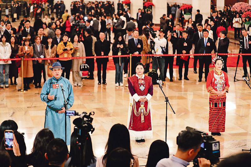2025年3月10日,全国政协十四届三次会议第三场“委员通道”在人民大会堂举行。图为少数民族委员亮相“委员通道”。 民族画报记者 康梦婷/摄